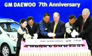 10月15日,韓國仁川,通用大宇慶祝7歲生日。通用汽車首席執行官韓德勝(右三)、通用汽車公司執行副總裁羅瑞立(右一)與通用大宇領導層切蛋糕。在當日的新聞發布會上,韓德勝稱,出售歐寶的談判仍在繼續進行。2001年10月17日,通用汽車與其合作伙伴鈴木汽車及上汽集團,共同收購了大宇汽車66.7%的股份。