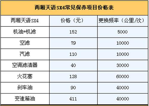 4.保養費:我們向長安鈴木4S店售后服務人員咨詢過,廠家規定天語SX4的首保時間為兩個月或者1500~2500公里(以先到為準),正常保養周期為5000公里,假設一年跑2萬公里,一年則需要做保養4次。第一次常規保養(只更換機油機濾,首保免費)費用為152元;第二次(更換機油機濾+空氣濾芯+汽油濾芯)為341元;第三次常規保養(更換機油機濾)152元;第四次(更換機油機濾+空氣濾芯+汽油濾芯+變速箱油)為411元,此外空調濾芯3萬公里更換,剎車油4萬公里更換,那么2年/4萬公里的保養費用為2242元,平均一年兩萬公里需花費為1121元左右。