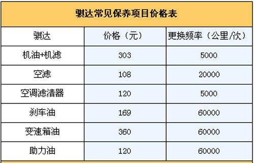 4.保養費:我們向東風日產4S店售后服務人員咨詢過,騏達常規保養周期定為每5000公里一次,首保在購車后行駛1000km或一個月進行(以先達到者為限),二保5000公里時進行,前兩次保養免費。假設一年跑2萬公里,則需要做保養四次。前三次都為常規保養(只更換機油機濾),一次303元、一次379元交替進行。第四次保養(更換機油機濾+空濾+空調濾芯)為637元;如此一個周期往復。另外4萬公里保養時需要更換剎車油和變速箱油,保養價格為1090元,那么2年/4萬公里總費用大概需要3318元左右,平均一年為1659元。