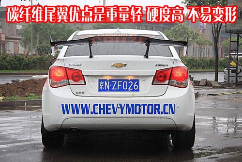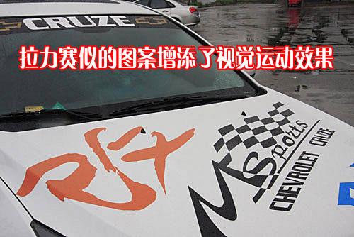 引擎蓋上的改變顯而易見,增加了大面積的貼畫,包括拉力賽中黑白相間的旗子造型。在細節方面,前輪眉處標有CHEVROLET雪佛蘭的標語,與車頭“金領結”遙相呼應;前風擋上CRUZE的字樣是專門為這款車而打造,在字的兩側分別刻有“金領結”的標志。