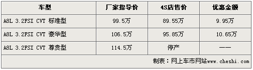據4S店銷售人員介紹,奧迪A8L 3.0車型已于日前正式上市,但由于該車型為原裝進口,所以預訂周期為6個月,且訂金為10萬元。另據該銷售人員表示,目前奧迪A8L 3.2車型除尊貴型停產外,其余兩款車型均有大幅優惠。其中奧迪A8L 3.2優惠幅度達10.65萬元,而入門級車型優惠后售價僅為89.55萬。