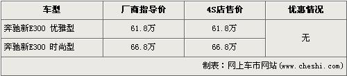 據北京奔馳4s店銷售人員介紹,奔馳新E級先期上市的車型為E300優(yōu)雅型和E300時尚型,售價分別為61.8萬元和66.8萬元。前期預訂新E級的車主已經可以到店內提車,近期欲購買奔馳新E級的消費者需交1萬元訂金,9月份才可提車。