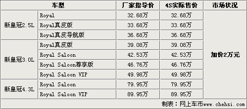 一汽豐田旗下旗艦車型新皇冠于昨日正式發布,新皇冠分別搭載了2.5L、3.0L和4.3L引擎,共計9款車型,售價32.68萬-89.95萬元。皇冠作為一汽豐田旗下旗艦版車型,自進入國內市場以來就一直擁有較好的口碑,新皇冠無論在性能還是配置方面,較老款都有很大的提升。所以自打在國內一亮相,就備受中國消費者的關注。同時我們也從北京地區一汽豐田4S店了解到,目前4S店內均沒有展車,第一批車輛要到12月20號左右才會到店,消費者最早要到明年1月才能提到現車,而且要加價2萬元現金。具體車型售價見下表: