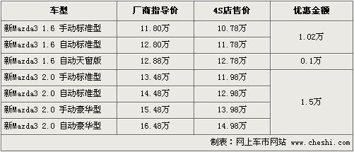 馬自達3自4月份1.6L的自動天窗版車型上市以來,一直受到消費者關注。運動與操控完美結合讓馬自達3擁有較好的口碑。根據網上車市價格監測系統顯示,馬自達3現最高優惠1.5萬元,1.6L有少量現車供應。具體行情如下: