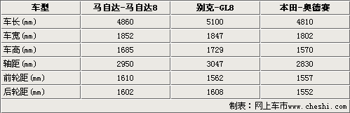 國產馬自達8的車身尺寸為長4860mm;寬1852mm;高1685mm,完全達到了大型MPV的身材尺寸。從上表我們可以看出馬自達8的身材處于別克GL8和本田奧德賽之間,但是馬自達8的車型是三款車最寬的,相比其它兩款車型它的橫向空間是最寬裕的。馬自達8的軸距達到了2950mm,將近3米的長度完全可以滿足多人商務用途。