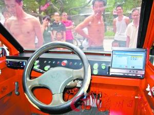 車前的大燈和轉向燈,車后的剎車燈和倒車雷達和正規的小轎車幾乎沒兩樣,4個車門雖然還沒有裝玻璃,但是門和門框結合密實。車內前面只有一個駕駛座,駕駛座左手邊是有5個擋位的擋桿,后面是一個可折疊的并排兩座位。一個從“五菱”車上淘來的方向盤控制車的轉向,方向盤后是平整的控制臺,上面按了大燈、倒車雷達、散熱風扇和電子打火等不同顏色的按鈕,最讓人驚嘆的是,在操控臺兩邊還安裝了一個可自動伸縮的DVD播放系統。