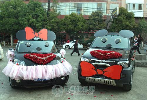 大紅色的蝴蝶結、黑色靈巧的眼睛、玫瑰花鋪成的鼻子,一輛小型越野車經過巧妙的裝扮,變成了可愛的“米老鼠”。一旁,站著“Mickey”的愛人“ MINI[綜述 圖片 論壇]”。粉色的公主紗、車頂戴上蝴蝶結、滿天星花朵做成長長的睫毛、配上黑黑的大眼睛,比亞迪小車搖身一變成了“MINI”、“Mini”嬌羞地站在“Mickey”旁邊,引得路人駐足觀看。“太可愛了,車子這樣一打扮,都認不出原貌了,比奔馳還拉風,真有創意!”一名男士拿出手機,為兩只可愛的“米老鼠”拍照。兩輛造型可愛的婚車,引來不少路人拍照留念。