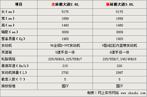 新款林蔭大道3.6L車型排量沒(méi)有提高,但整備質(zhì)量提高了25 kg。輪胎從原來(lái)的225/55R17升級(jí)到245/45R18,提高了車輛的穩(wěn)定性能。更換的6速變速器也使車輛最高車速由215公里提高到220公里。