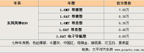 1月27日,備受期待的東風風神首款精品兩廂車東風風神H30,以“從容進取、自由人生”為產品主張,在“自由之都”——成都拉開了全國自由上市帷幕。東風汽車公司副總經理、東風乘用車公司總經理李紹燭公布了東風風神H30五款上市車型的價格:1.6MT尊雅型7.58萬元,1.6MT尊貴型8.38萬元,1.6AT尊雅型8.38萬元,1.6AT尊貴型9.48萬元,1.6AT 電子導航型9.98萬元。