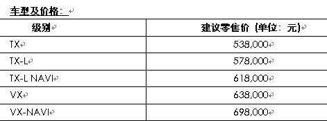 作為舊款VX級別車型的延續,TX-L級別配置更加豐富,采用4.0L雙VVT-i的發動機,性能大幅提升。除沿用了舊款VX級別所配備的主動牽引力控制系統A-TRC以及車輛穩定控制系統VSC外,還增加了第三排座椅電動折疊功能、智能鑰匙及一鍵啟動系統、自發光式儀表盤等,同時,SRS空氣囊也增至7個。在這種配置下,TX-L級別的價格設定為57.8萬元,比舊款VX級別的價格還低7千元。