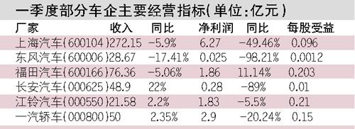 中國汽車工業(yè)協(xié)會的統(tǒng)計數(shù)據(jù)顯示,今年一季度汽車產(chǎn)銷256.76萬輛和267.88萬輛,同比增長1.91%和3.88%。盡管結(jié)束了去年四季度銷量下降趨勢,但從部分披露一季報的上市公司來看,由于一季度汽車銷量增長主要是受小排量車和微客的帶動,而這兩類車單車利潤偏低,利潤豐厚的B級車出現(xiàn)了滯銷情況,導致大量車企出現(xiàn)“增產(chǎn)不增收”的怪現(xiàn)象,利潤同比下降近五成,東風和長安的凈利潤下降了八九成,只有個別企業(yè)出現(xiàn)一定車程度的增長。