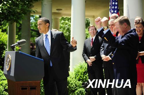 5月19日,美國總統奧巴馬在首都華盛頓白宮玫瑰園發表講話,福特汽車公司首席執行官阿蘭·穆拉利(前右)在一旁舉手歡呼。當日,奧巴馬宣布一項新的針對小型汽車和輕型卡車的排放標準和油耗標準,該標準將于2012年起開始實施。根據要求,到2016年小型汽車和輕型卡車的平均能耗將達到每加侖汽油行駛35.5英里(即每100公里耗油約8升)。 新華社記者張巖攝