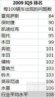 JD Power的2009年研究,訪談超過了80900名買家,關于他們頭三個月的使用情況,共提問228個問題,這項研究從2月進行到5月。這項研究共包括了37個品牌,基于2009款車型,統計在頭90天內被車主發現的質量問題。