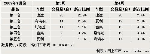 今日,筆者從北京中聯(lián)汽車交易市場了解到,隨著二手車市場淡季持續(xù)深入,二手車收購和銷售放緩趨勢明顯,并呈現(xiàn)出兩級分化趨勢,中低端車銷量趨于良好,高端車滯銷明顯。上周的二手車交易量比6月份有所減少。根據(jù)7月份最后兩周的銷量排名來看,實(shí)用、經(jīng)濟(jì)型轎車還是受到消費(fèi)者的追捧。詳見下表: