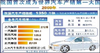 中國汽車技術研究中心首席專家黃永和10日對記者說,2009年中國汽車產銷超過1350萬輛,首次成為世界汽車產銷第一大國。他預計2010年中國汽車產銷會超過1500萬輛,跨國汽車公司將從中繼續受益。據新華社電