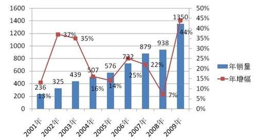 2001-2009年中國汽車銷量增長表 單位:萬輛(數據來源:中國汽車工業協會)