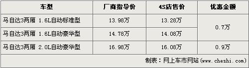 馬自達3兩廂是一汽馬自達以進口方式引入的車型,售價為13.98—16.98萬元。馬自達3兩廂車型在上市時憑借出色的動力性能以及動感飽滿時尚的外形贏得了廣大消費者的青睞,近日據網上車市網站價格監測系統顯示:馬自達3兩廂全系最高優惠9000元,具體車型見下表: