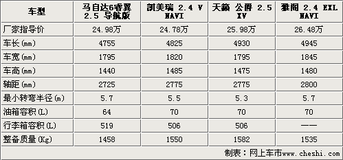 我們選取的四款車型都是位于該車系中的頂配車型,售價(jià)都在25萬(wàn)元左右,馬自達(dá)6睿翼在這四款車型中屬于售價(jià)比較低的。在車身尺寸方面馬自達(dá)6睿翼是4款車型中最小的,同時(shí)在軸距方面也只有2725mm,這意味馬自達(dá)6睿翼在這四款車型中的內(nèi)部尺寸應(yīng)該是最小的。雅閣的軸距是四款車型最大的,達(dá)到了2800mm,保證了雅閣內(nèi)部空間的寬敞。凱美瑞和天籟•公爵都同時(shí)擁有2775mm的軸距,它們?cè)趦?nèi)部空間上將不會(huì)有太大的差距。四款車型中除了馬自達(dá)6睿翼外其余三款車型均達(dá)到了70升。由于馬自達(dá)6睿翼身材較小,所以在整車質(zhì)量方面它也是4款車型中最輕的。