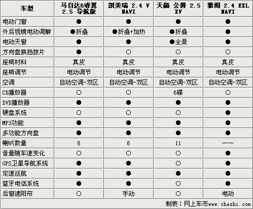 上述四款車型都屬于該車系中的頂配車型,所以在舒適配置方面可謂是應(yīng)有盡有,電動(dòng)天窗、真皮座椅、自動(dòng)雙區(qū)空調(diào)、多功能方向盤(pán)等設(shè)備都成為了標(biāo)準(zhǔn)配置。但仔細(xì)看下來(lái),天籟•公爵的全景天窗比較突出,這是同級(jí)別車型中很少可以看見(jiàn)的。在娛樂(lè)方面,天籟•公爵的11揚(yáng)聲器系統(tǒng)比較突出,音像水平完全達(dá)到了發(fā)燒的級(jí)別。而雅閣的硬盤(pán)系統(tǒng)顯示出了它的科技感。四款車型中,只有天籟•公爵沒(méi)有配備GPS衛(wèi)星導(dǎo)航系統(tǒng)外。