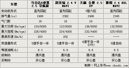 通過(guò)以上橫向?qū)Ρ龋梢钥闯鏊目钴嚨呐帕慷荚?.4這個(gè)區(qū)間,但是在發(fā)動(dòng)機(jī)形式方面卻完全不同。馬自達(dá)6睿翼、雅閣和凱美瑞都為直列四缸發(fā)動(dòng)機(jī),天籟•公爵則采用的是被評(píng)為十佳的VQ發(fā)動(dòng)機(jī)(V型六缸)。值得一提的是這四款車型都具備了日系發(fā)動(dòng)機(jī)傳統(tǒng)的特點(diǎn):性能良好、油耗經(jīng)濟(jì)。由于天籟•公爵采用的是V型六缸發(fā)動(dòng)機(jī),所以在動(dòng)力輸出方面相比另外三款車型要明顯突出。在變速箱方面,天籟•公爵配備的是全新6速手自一體CVT變速箱,相對(duì)另外三款車型的變速器來(lái)說(shuō)天籟•公爵則更可以體驗(yàn)到駕駛的樂(lè)趣。四款車型的制動(dòng)系統(tǒng)都是前通風(fēng)盤(pán)后實(shí)心盤(pán)。