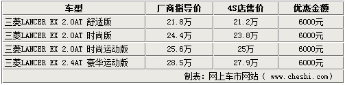 據(jù)經(jīng)銷(xiāo)商透露,由于剛剛經(jīng)歷了召回風(fēng)波,所以基于市場(chǎng)以及銷(xiāo)量等多方面的考慮,才開(kāi)始優(yōu)惠促銷(xiāo)。除最低配置的舒適版車(chē)型各家店內(nèi)均無(wú)車(chē)需要單獨(dú)預(yù)訂外,其他車(chē)型均有現(xiàn)車(chē),且顏色齊全。全系LANCER EX車(chē)型均在原價(jià)基礎(chǔ)上優(yōu)惠6000元,消費(fèi)者可隨意挑選。