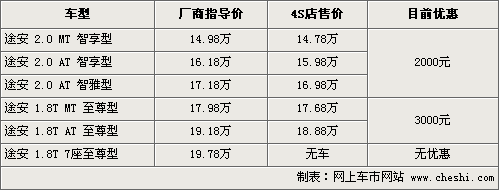 2月份,上海大眾進行了09年首次價格調整,新途安的價格下調了3100元-3500元,售價為14.98萬-19.78萬。根據網上車市價格監測系統顯示,在官方調整價格基礎后,近期4S店還有2000元-3000元的降幅,具體行情如下: