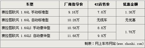 據經銷商處銷售人員介紹,賽拉圖歐風全系最高出現1.78萬元的優惠。賽拉圖歐風在售的有4個車型,入門級的1.6L手動標準版經1.38萬元的優惠后,售價從廠商指導價9.18萬元降到7.8萬元,1.6L豪華版的手動版和自動版車型都經全系最高1.78萬元優惠后,售價分別降至8.8萬元和9.9萬元。經銷商處銷售人員還介紹,由于1.6L自動標準型沒有現車所以沒有在此次優惠的列隊中,其他車型店內現車充足。