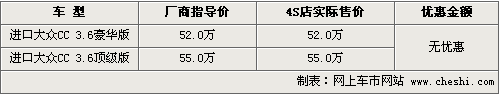 自去年廣州車展大眾CC亮相后,它的車型以及售價一直備受關(guān)注,同時這款車搭載的6速DSG雙離合變速箱以及四輪驅(qū)動系統(tǒng)均成為其關(guān)注亮點(diǎn)。目前筆者從進(jìn)口大眾北京地區(qū)經(jīng)銷商處了解到,進(jìn)口大眾CC現(xiàn)車已經(jīng)到店,并有多種顏色可選,具體車型以及價格如下: