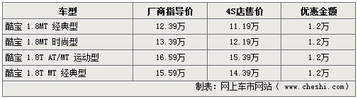 據4S店銷售人員介紹,此次酷寶系列車型涉及系列內各款車型,1.8L手動時尚型及1.8T自動版運動型車型的現車各店最高可給出12000元的現金優惠。而1.8T系列車型部分顏色需要訂購,優惠幅度同樣可達到1.2萬元;操控效果極佳的手動擋1.8L車型現車充足,享受優惠的同時還可由經銷商處添置價值近千元的車身裝飾,但不能折換現金。