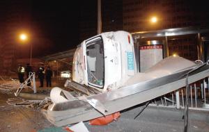 事發(fā)后,現(xiàn)場的兩條機(jī)動車道被封鎖,10多米長的護(hù)欄已被撞倒,公交站亭一半被撞毀。白色三菱車頭嚴(yán)重變形,側(cè)翻在輔路上。目擊者李先生說,當(dāng)時該車在主路上行駛,撞毀公交站亭后側(cè)翻,男司機(jī)從車內(nèi)自行爬出,渾身帶著酒氣。