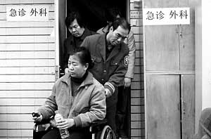 昨日,公交公司的工作人員將受傷的女乘客推出急診室