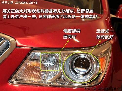在細節上,新君越更加精致,前臉的大型鍍鉻格柵是家族傳統,但新君越的格柵更加圓滑,更加具有通透感,大燈的形狀更向上翹,甚至達到了發動機蓋的中部,燈組應該是和新君威一樣的遠近光雙氙燈+彎道輔助照明燈。