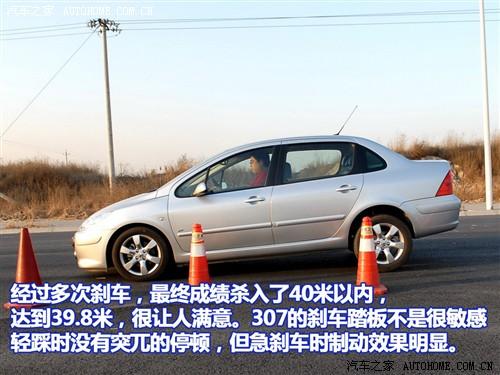 標致307沒有裝備什么特殊的剎車系統,也沒有速騰冠軍版那樣的寬胎,但剎車成績還是不錯的,39.8米比我們定義的優秀剎車距離最高線42米要短不少,而且在連續剎車測試中,剎車系統和輪胎的熱衰性控制的很好,基本沒有出現因過熱而增大距離的情況。只是由于307的懸掛調教偏軟,全力制動時前懸掛被壓縮到極致,后輪幾乎沒有附著力,此時車輛穩定性比較令人擔憂。