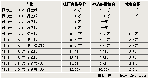 據廣州豐田4S店銷售人員介紹,目前廣州豐田各4S店內雅力士1.3L現車較少,而1.6排量的車型就相對比較充足,并可提供試乘試駕服務。銷售人員表示,現在到店購買雅力士的消費者可享受到最高達2.5萬的價格優惠,還可得到商家贈送的簡單裝飾等。消費者可在展廳內近距離接觸展車、親身體驗試駕車后直接購買現車。