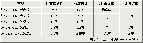 筆者從進口大眾經銷商處了解到,相比2月份途銳的優惠幅度,目前優惠有進一步加大,其中途銳V6三款車優惠現金5萬元,而途銳4.2L頂級版則優惠9萬元現金,比上月優惠幅度均增加2萬元。但據4S店銷售人員介紹,目前3.6標準版和6.0頂級版尚沒有現車,其他各款有黑色和銀色可選擇,但數量非常少。在內飾顏色方面,途銳有米黃色、灰色、黑色和棕色四款可供選擇,而一般大眾顏色為米黃和灰色。近期,途銳將有部分新車到店,消費者可到4S店看車試駕。