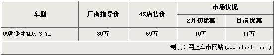 據謳歌經銷商銷售人員介紹,謳歌08款MDX已經停止進口現車已賣完,以后也不會再引進。目前在售的為謳歌09款MDX車型,09款謳歌-MDX的優惠現已加大到11萬元,優惠后售價也從原廠商售價80萬降到了69萬,跌破了70萬元。銷售人員還介紹,09款謳歌MDX增加的實用性的配件包括前下護板和后下護板,能避免惡劣路況對底盤帶來的損傷,并且09款謳歌MDX還新增了巴厘海藍和摩卡褐金兩種顏色,店內現車非常充足,顏色也比較全,欲購買者挑選的空間非常大。