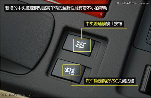 在排檔桿的后方,是中央差速鎖鎖止按鈕和汽車穩定系統VSC關閉按鈕。汽車穩定系統VSC相當于德系車常見的ESP系統,對于穩定高速行駛的車輛有著很大的幫助。此外,新RX350還標配了上坡輔助系統HAC、防抱死制動系統ABS配制動力輔助系統BA、電子制動力分配系統EBD、牽引力控制系統TRC、汽車動態中和管理系統VDIM,可以給駕駛員和乘客以最好的保護和輔助。