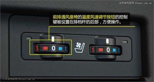 前排通風座椅的溫度風速調節按鈕的控制鍵被設置在排檔桿的后部,方便操作。在夏天極為炎熱的廣東地區,該項功能顯得非常實用。