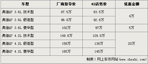 據經銷商銷售人員介紹,奧迪Q7分為3.6L和4.2L兩種排量共7款車型,目前全系最高優惠為20萬元現金。3.6L中的技術型和舒適型優惠4萬元,優惠后售價分別為:技術型83.5萬元,舒適型92.8萬元。3.6L豪華型經5萬元優惠后售價降到了97萬元。排量更大的4.2L車型優惠更是達到了20萬元,優惠后售價分別為技術型129.8萬元,舒適型138萬元,豪華型145萬元。