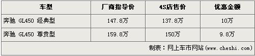 據經銷商處銷售人員介紹,目前國內在售的奔馳GL級分為GL450 經典版與GL450 尊貴版,上個月兩款車型的優惠金額分別為3萬元和4.8萬元,近日奔馳GL系的優惠金額暴增,優惠近額分別漲到了10萬元和9.8萬元。經優惠后,低配車型的經典版售價將為了137.8萬元,首次跌破140萬,高配的尊貴版車型售價也降為了150萬元。