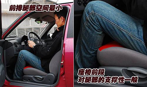 力帆320前排座椅采用包裹性較強的織布運動型座椅,靠背對身體的包裹性非常不錯。但座椅坐墊比較窄小,對腿部的支撐性還是感覺不太到位,但作為一款微型轎車,我們并不能要求太多。