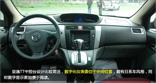 景逸TT的儀表盤位于中控的正中央,紅色的背光特別醒目,發動機轉速、車輛時速、油料情況、音響、空調控制等信息都能得到充分的顯示。中控臺上采用人機工程學原理設計的各種按鍵,簡單易用,處處體現了人性化關懷的設計元素。而且,“景逸TT”換擋桿也移至了中控臺上,不僅使用順手便利,更為駕駛員右側騰出了更大的活動空間。
