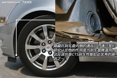 做完剎車測試,我們又對新CTS的輪胎,剎車盤片進行了仔細的觀察研究,發現在輪胎內側隱藏了一個出風口,正對著剎車盤。通過分析我們認定他的作用是對剎車盤降溫,這樣能夠讓剎車盤始終保持最佳狀態。看來新CTS能夠取得如此好的成績通用汽車在設計上確實下了一番苦心的。