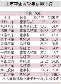 一般而言,年度薪酬是和整個行業效益成正比的,但從附表所列的情況來看,除了江淮汽車和海馬股份的董事長因為去年業績下滑厲害而自降薪酬外,其余車企掌門人的薪酬與2007年相比基本是穩中有漲,其中上海汽車與安凱客車則是與2007年持平,江鈴汽車、福田汽車和金龍汽車的掌門人2008年的薪酬同比2007年增長了三成左右,都在100萬元以上,足以讓乘用車企負責人“眼紅”。上海汽車、長安汽車和一汽轎車這些規模龐大的乘用車的一把手的薪酬也不過65萬元。