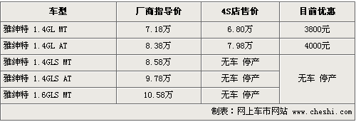 筆者從北京地區(qū)經(jīng)銷商處了解到,目前雅紳特各4S店均沒有現(xiàn)車供應(yīng),需要預(yù)訂,訂金需要交納1000元左右,15個(gè)工作日內(nèi)可以交車。雅紳特共有五款車型,但目前在售的只有1.4手動(dòng)標(biāo)準(zhǔn)和自動(dòng)標(biāo)準(zhǔn)兩款,車價(jià)方面,這兩款可分別優(yōu)惠3800元和4000元,其他三款據(jù)銷售人員介紹,均已經(jīng)停產(chǎn)。