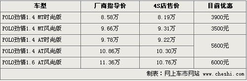 據(jù)4S店銷售人員介紹,目前POLO勁情現(xiàn)車比較緊張,只有少數(shù)車型有現(xiàn)車供應(yīng),同時(shí)各款車型在價(jià)格上的優(yōu)惠幅度也不一樣。1.4入門級(jí)車型優(yōu)惠現(xiàn)金3900元,其他各款優(yōu)惠從3500元-6000元不等。另據(jù)銷售人員介紹,消費(fèi)者如果預(yù)訂車型的話,需要先交訂金排隊(duì),一個(gè)月左右才能順利提到車現(xiàn)車。