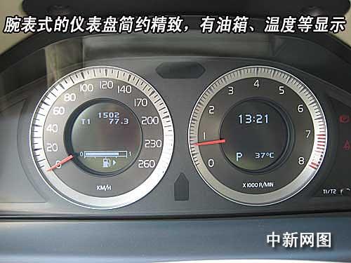腕表式的儀表盤簡約精致,沒有炫麗的燈光效果,看上去并不起眼。剩余油量和可行駛里程以數字方式顯示在車速表中央,當前時間、外界氣溫及檔位顯示在轉速表中央。所有儀表信息都采用中文顯示。