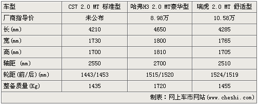 在基本參數方面,獵豹CS7要比源自轎車平臺的瑞虎還要小一些,車長只有4210mm,但軸距要比瑞虎大一些,當然三款車中哈弗H3明顯要大一號,無論車長還是軸距方面。也就意味著從外觀上看,哈弗H3將很大氣,而獵豹CS7要小巧一些。