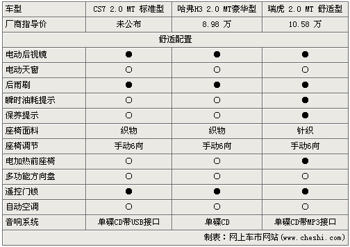 在舒適配置上,三款車的配置基本相當,都配有電動后視鏡、手動6向調節的針布座椅、普通空調、單碟CD音響,不過售價比較高的瑞虎還有比較人性化的瞬時油耗提示、保養提示,三款車都配置了遙控門鎖,方便駕駛者操作車輛。