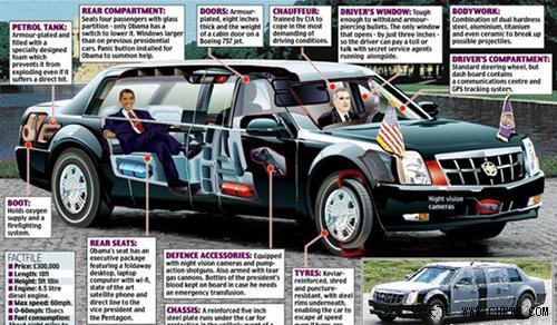 這輛車其實是在中型卡車的基礎上打造而成的。整車采用了被視為美國國家機密的雙重厚度高密度鋼板、鈦鋼合金和高強度陶瓷,以抵抗各種武器的襲擊,具有防彈功能的車門達8英寸厚,重量相當于波音757的艙門。